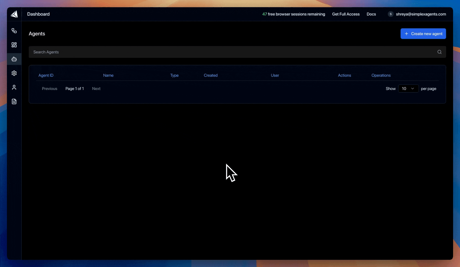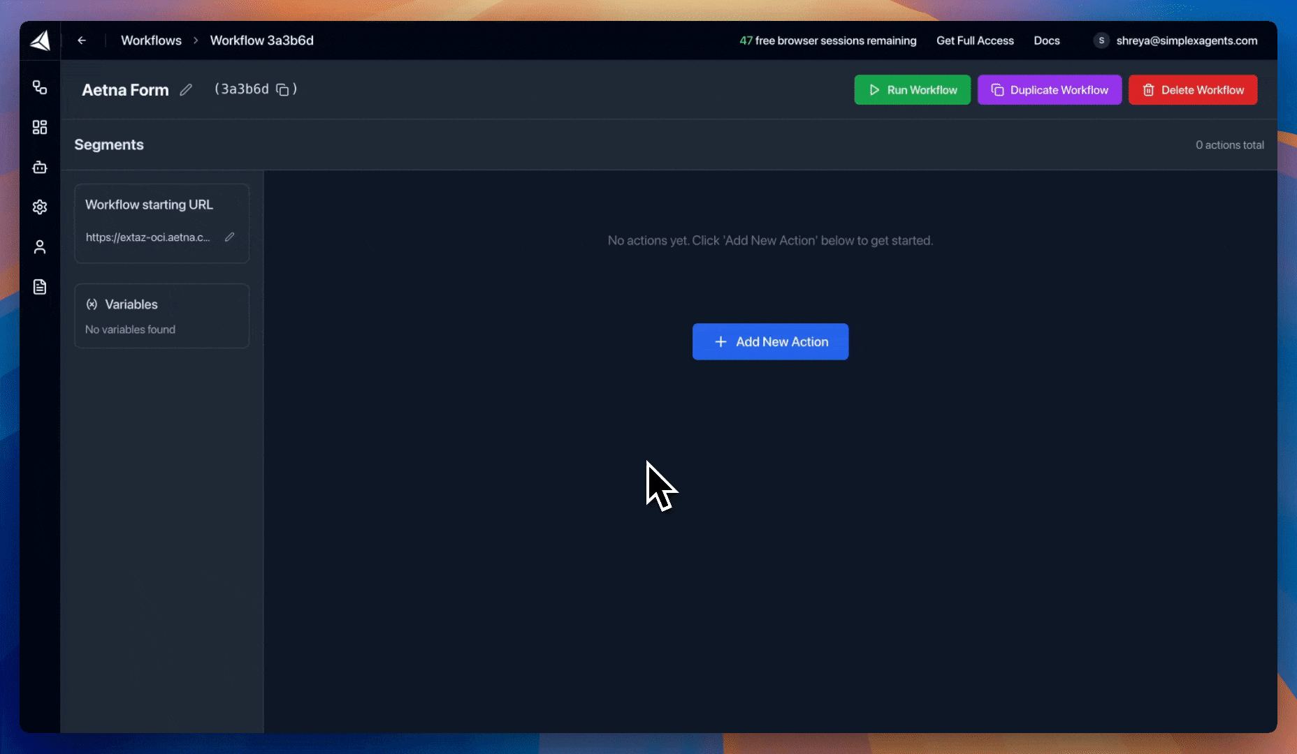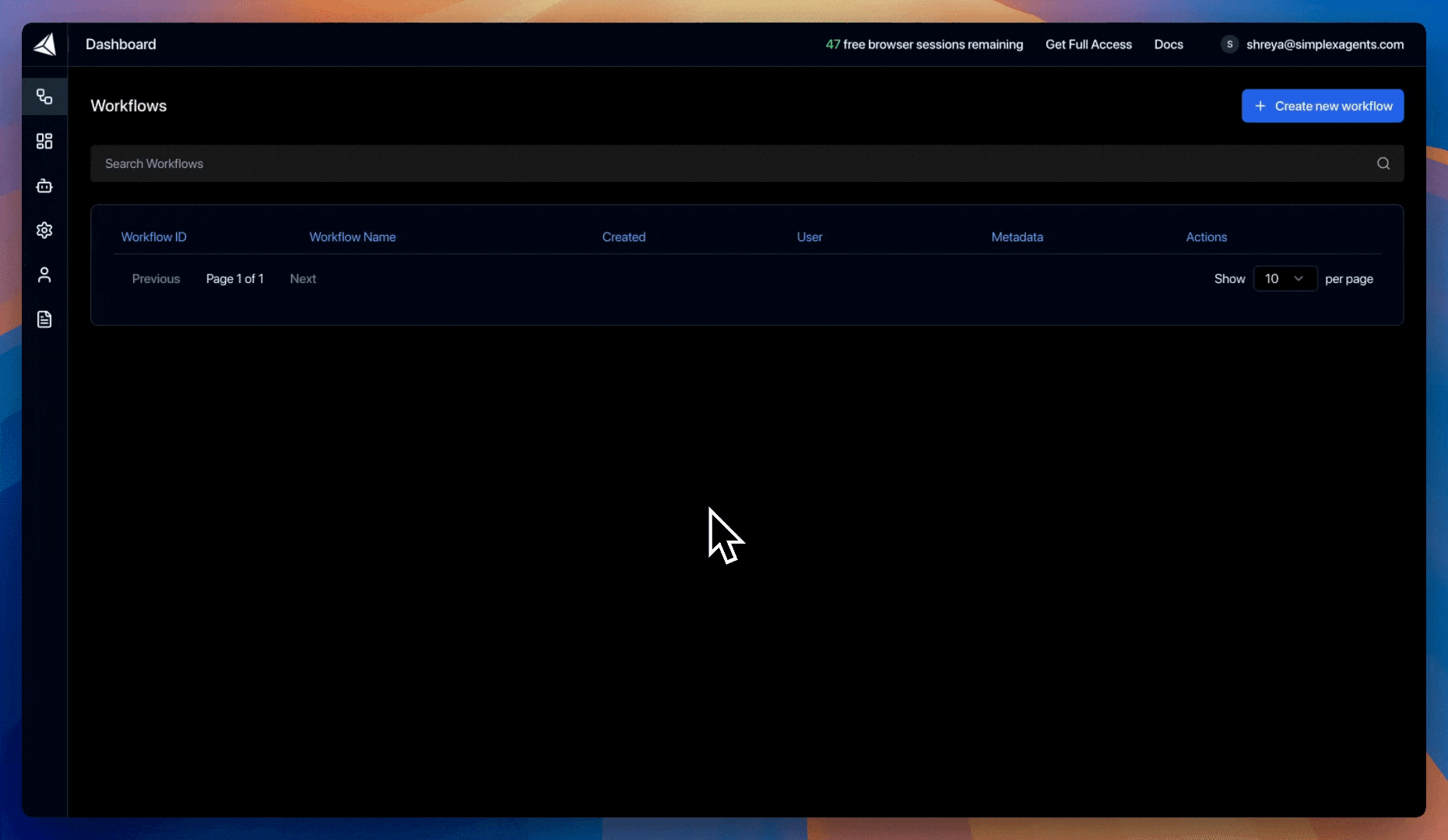 Run the workflow by defining the variables. View the live workflow session with agent logs and livestream in the Simplex dashboard.