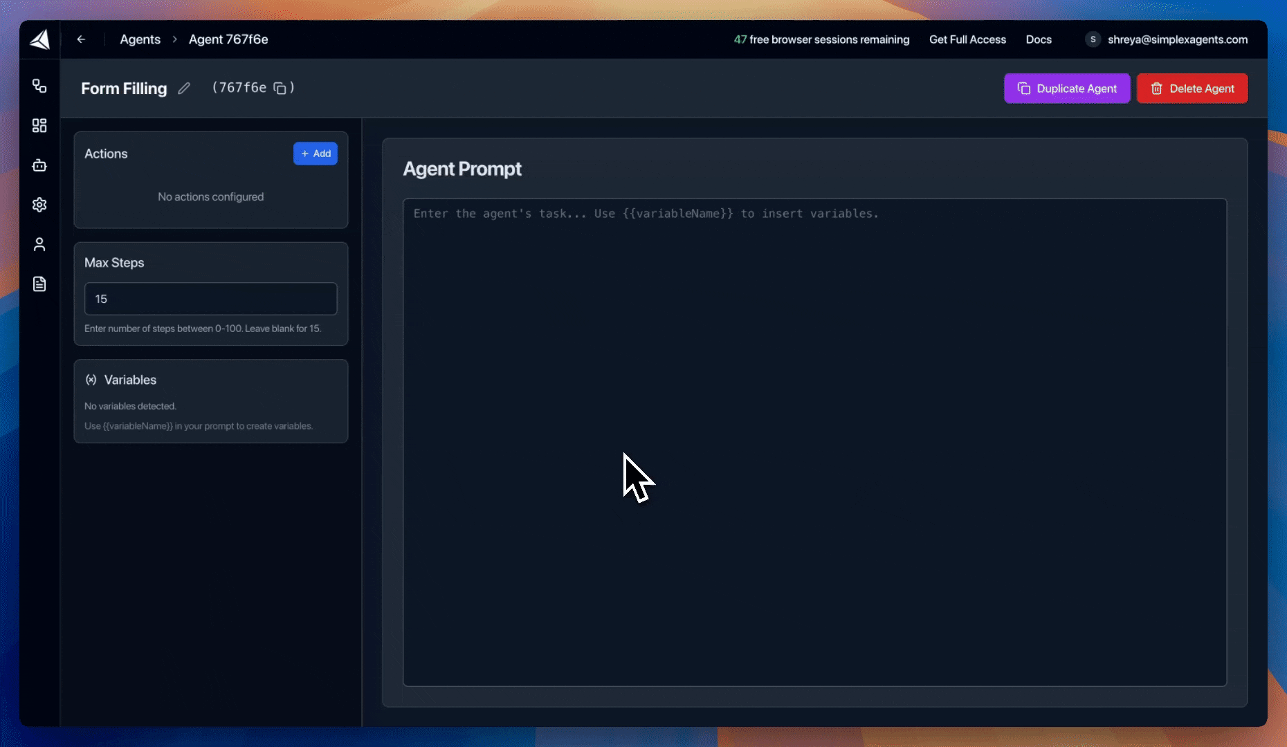Let’s start by creating a form filling agent. We will keep our prompt high-level so it can be used across a long tail of web portals.1